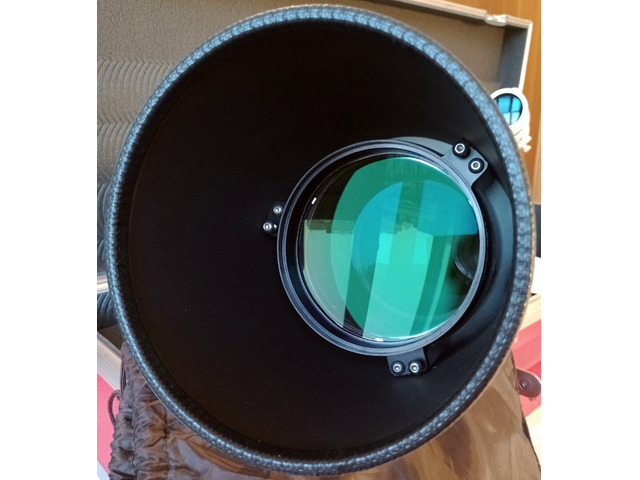Altre caratteristiche: cella obiettivo registrabile - grande focheggiatore con drawtube da 3", movimento a pignone/cremagliera a denti elicoidali (NON Crayford... = non slitta mai!) corsa ben 11,5 cm, compatto, pastoso e senza giochi; gioco e frizione registrabile; grande pomello di blocco - forniti due visual back intercambiabili da 2", uno tiraggio 39,5mm, con tre viti di blocco e anello di bronzo; uno da 19,5mm con due viti di serraggio - grande cercatore luminoso 8x50 con croce singola a filo sottile, supporto alto in alluminio con sei punti di regolazione.