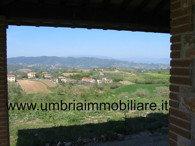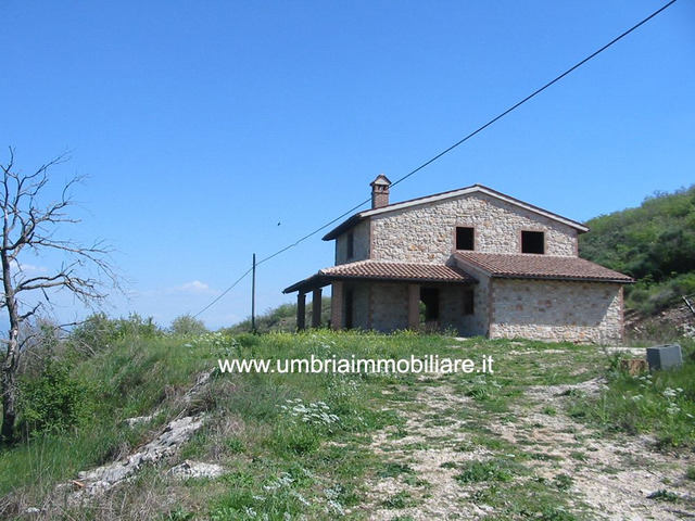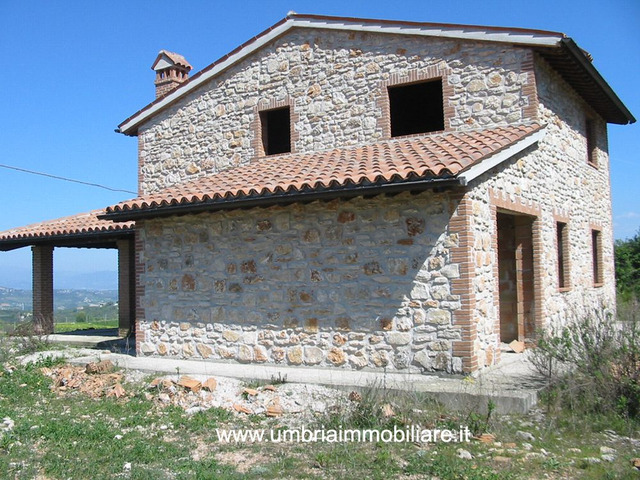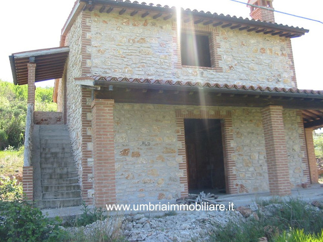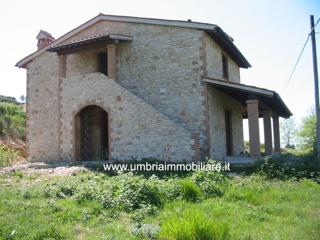 Villa in pietra, di mq.185, su due livelli, di nuova costruzione, realizzata in stile rustico di tipico casale umbro, solai con i travi in legno e pianelle in cotto. Il piano terra è composto da: ampia zona giorno + piano primo: zona notte con 3 camere e bagno. L'ubicazione è molto tranquilla e panoramica. La proprietà ha il terreno di mq.5000 circa con accesso facile dalla strada provinciale. Acqua ed elettricità da allacciare all’ingresso dalla proprietà.