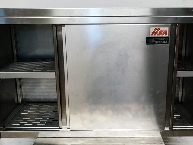 - TAVOLO ARMADIATO C/SCORR. 160X60 totalmente in acciaio inox, ripiano intermedio ad altezza regolabile, ante scorrevoli tamburate con maniglie incassate 180x70x85 *€300*