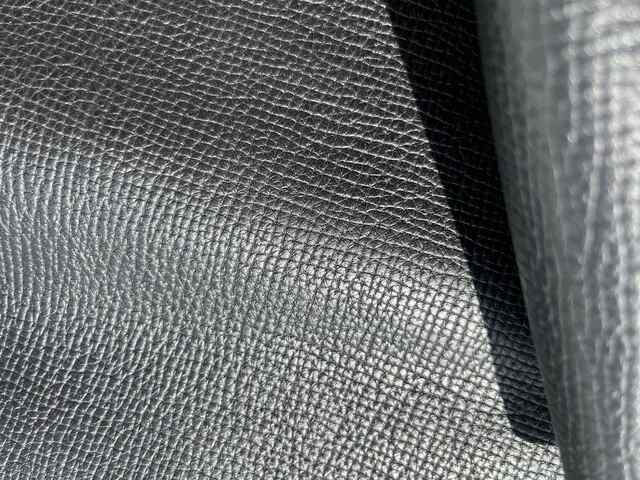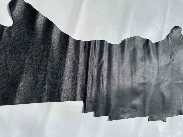 Pellame di vitello bottalato nero con una mano piena e morbida, pelle spessa stampata con una grana molto particolare, aspetto semi lucido, caratteristiche ideali per creazione di piccola pelletteria e molto altro..