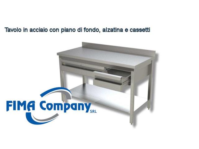 Tavolo in acciaio con piano di fondo, cassetti e alzatina