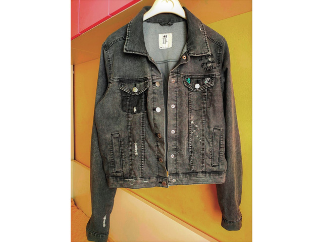 Giacca in jeans color grigio, donna, Taglia M. Marca H&M. Leggermente con dettagli strappati e scritti. Materiale elasticizzata, super comoda e molto morbida. Ha due taschini sul petto e due tasce davanti.