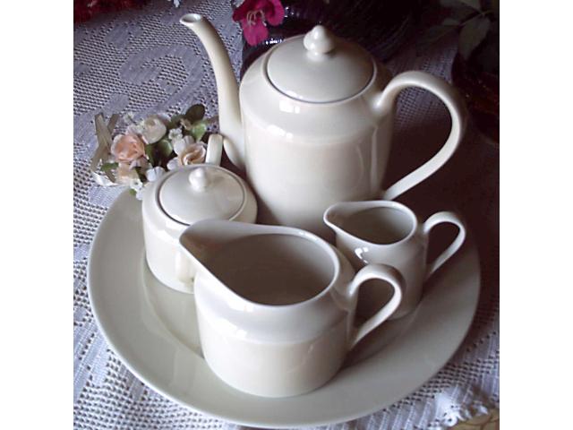 Elegante servizio di porcellana bianco-beige. Diametro piatto 30 cm e altezza brocca 21 cm. Nuovo. Bello anche per un regalo. 15€ (3€ al pz).