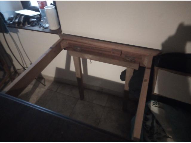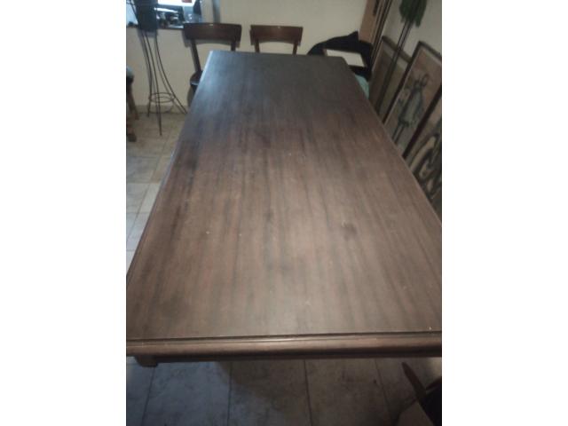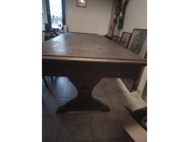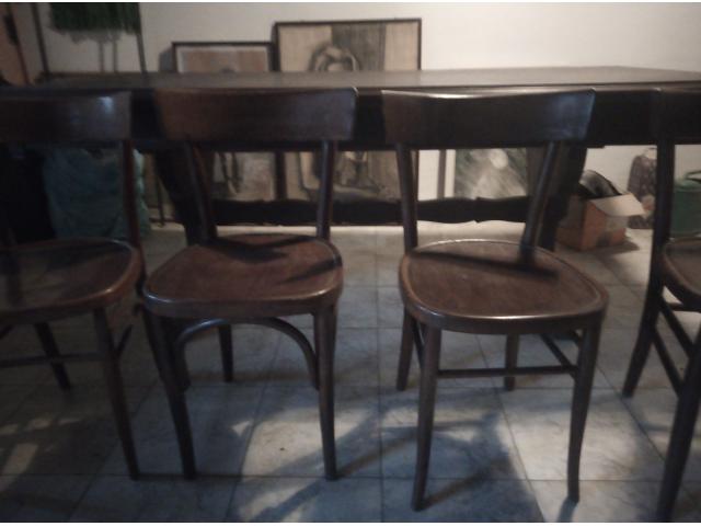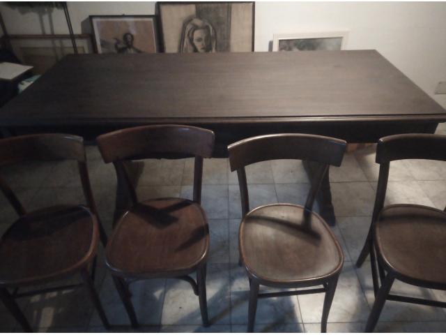 Tavolo in legno lungo 2 mt x 90 cm larghezza alto 80 cm, con 2 prolunghe a scomparsa dx e sx lunghe ognuno 2 mt con un totale lunghezza 6 mt, posti a sedere14-16 persone, e con cavalletti robusti in legno massello con 4 sedie tipiche da trattoria