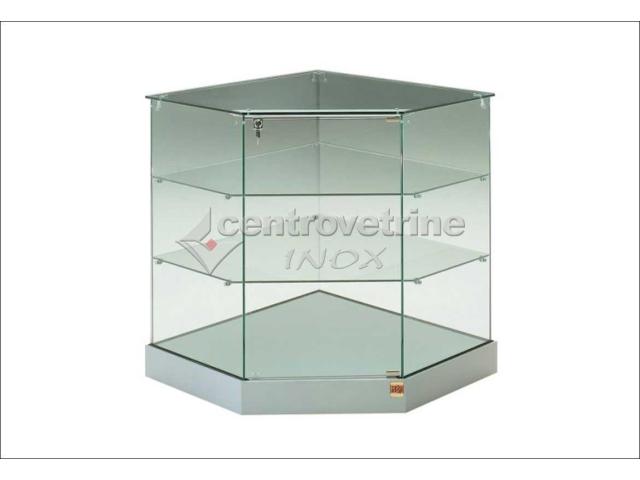 Vetrina espositiva angolare, serie LAMINATO 92/AG, con vetri in cristallo temperato, n.1 anta battente con serratura, n.2 ripiani e base con ruote a scomparsa.