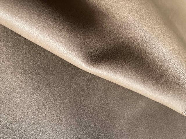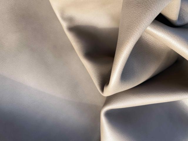 Pelle di vitello bottalato morbida al tatto di colore tortora, pellame di alta qualità pieno fiore con una bellissima grana dollaro per la produzione di borse, borselli, cartelle, zaini, portachiavi, legatoria e altri articoli di pelletteria.