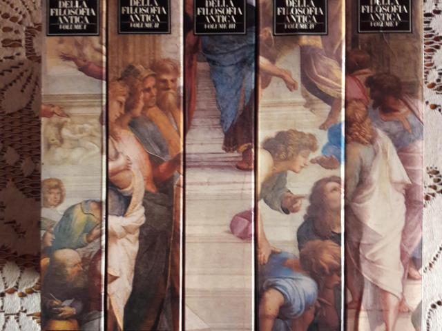 Storia della filosofia antica di Giovanni Reale(vol 1: Dalle origini a Socrate,pp493; vol 2: Platone e Aristotele,pp607; vol 3: I sistemi dell'età ellenistica,pp571; vol 4: Le scuole dell'età imperiale,pp701; vol 5: Lessico,indici,bibliografia,pp605),Vita e Pensiero,1992, 5 volumi indivisibili in brossura,come nuovi.